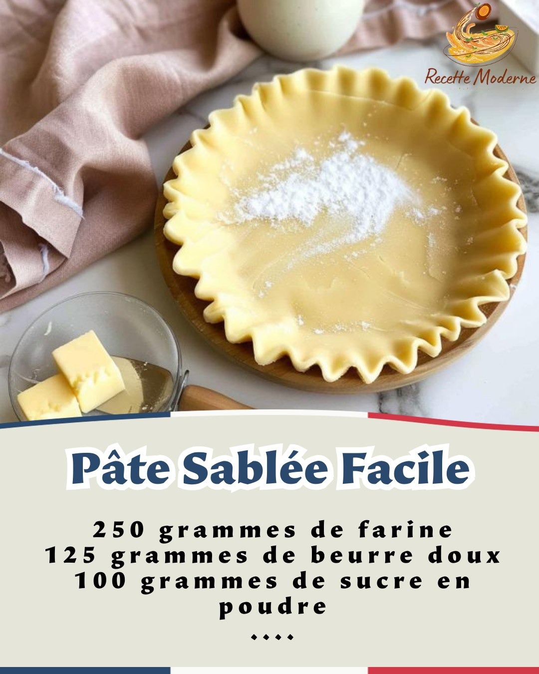 Pâte Sablée Facile 🍰 📋 Ingrédients pour une pâte sablée facile : 250 grammes de farine 125 grammes de beurre doux 100 grammes de sucre en poudre 1 œuf Une pincée de sel 🥣 Préparation de la pâte sablée facile : Étape 1 : Préparation de la pâte sablée Dans un grand saladier, versez la farine tamisée et … Lire plus